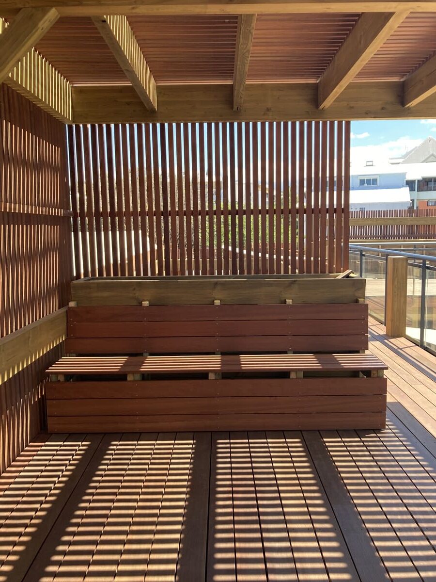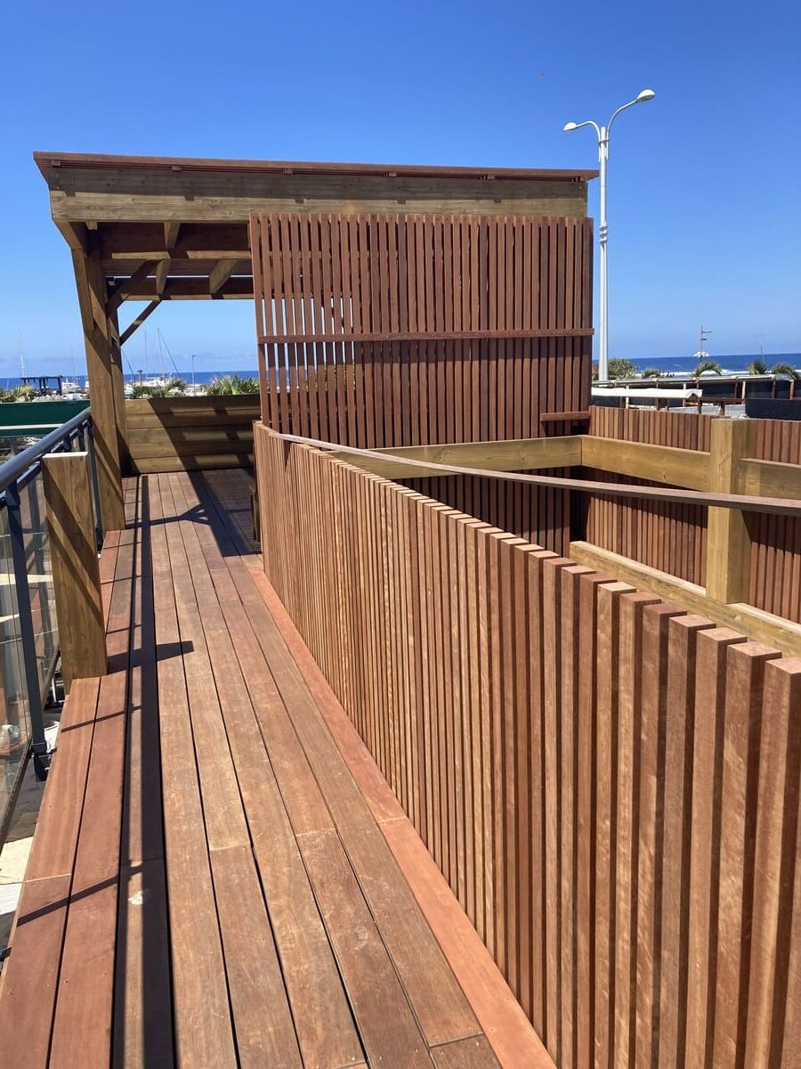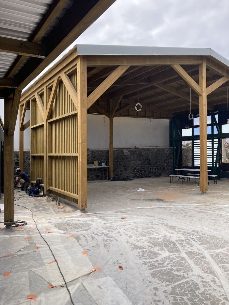 Le projet reste économique et simple: un restaurant outdoor avec un budget maîtrisé mais une volonté ambitieuse et qualitative pour une ambiance incontournable et inoubliable. Les contraintes du site nous imposent une façade rue sur une hauteur de 4m en RDC sur le Bd du front de mer, qui sera réalisée par un ensemble menuisé vitré en partie ouvrant pour une bonne ventilation de la salle de restaurant extérieure couverte. Cet ensemble de façade extérieure sera contreventée par un ouvrage de type poutre treillis métallique en acier galvanisé à chaud et thermolaqué pour résister aux vents cycloniques et aux embruns marins. En arrière plan se trouve une grande charpente bois apparente qui comprend une toiture tôle isolée permettant l’utilisation de la salle de restaurant lors d’épisodes pluvieux. La cuisine, le bar et les sanitaires publics sont quant à eux installés dans des containers aménagés qui seront habillés de tasseaux de bois et de murs végétaux côté accès au public. Profitant de cette disposition, un roof top en ossature bois est aménagé sur le toit des cuisines et du bar, celui-ci comporte une tribune VIP avec vue plongeante sur la scène au RDC qui accueillera des artistes pour quelques animations en soirée.