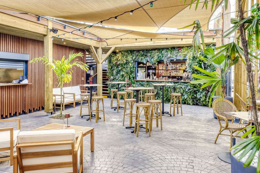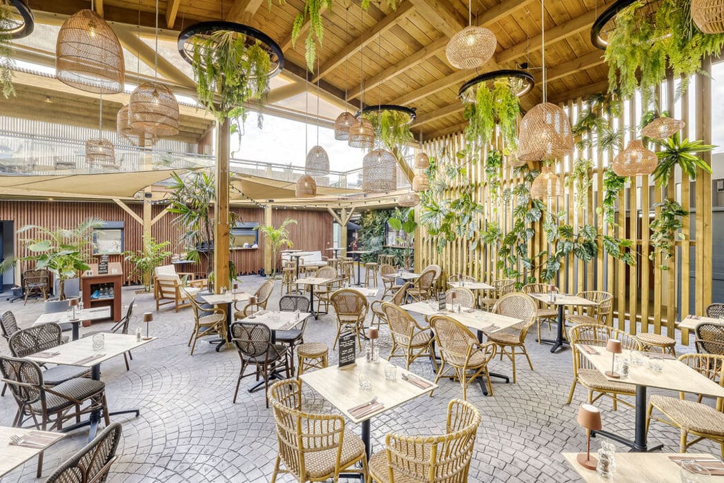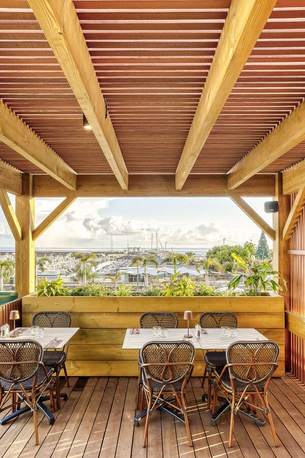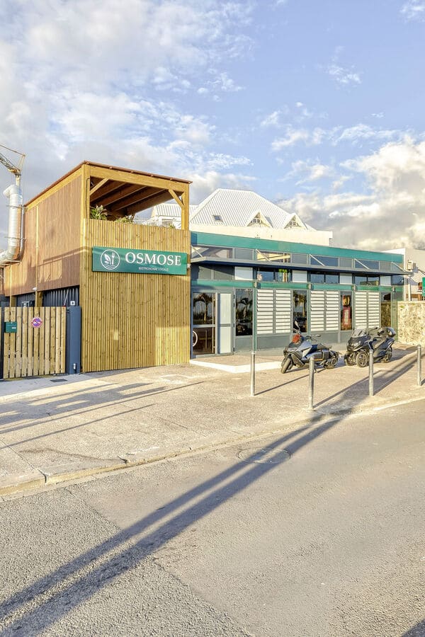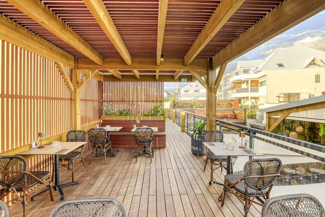 L’ensemble a un aspect majoritairement bois, appuyé par le métal et l’aluminium en façade qui confèrent une dynamique et une isolation acoustique face à la façade sur le boulevard du Front de Mer. Le lieu est décoré et meublé selon les propositions des architectes d’intérieur DÉCOGITÉ et les luminaires de LEDS RUN, qui contribuent à l’image végétale et lumineuse de ce restaurant. Le projet tout juste livré sera sous peu un lieu incontournable des soirées animées Saint Pierroises.