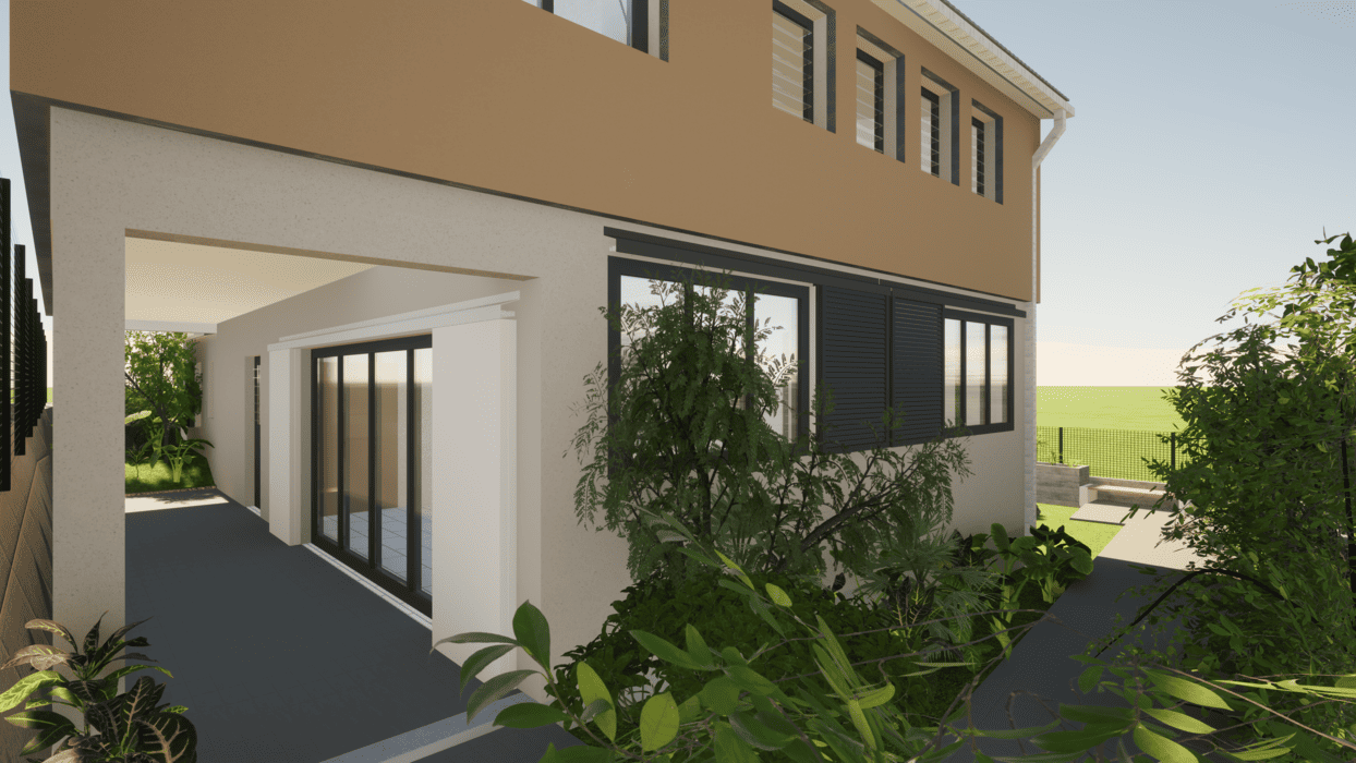 La volonté de livrer un bâtiment construit avec des matériaux durables dans ce climat humide des hauts de l’Ouest de l’ile est forte: façades protégées d’un bardage en lames de fibre ciment, toiture isolée, façades largement ventilées pour éviter la climatisation, vide sanitaire et mise en place d’un récupérateur d’eau de pluie connecté sur la plus grande toiture et alimentant l’arrosage du jardin.